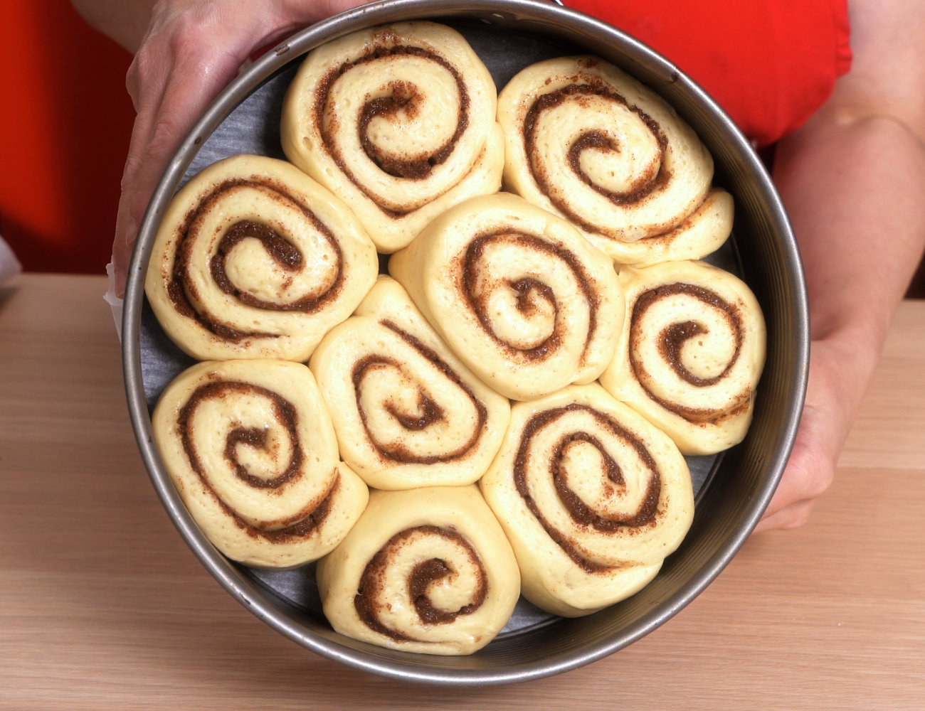• Arrotolate l'impasto per formare un tronco di 20 cm. Tagliate in 9 girelle di dimensioni uguali di circa 4 cm ciascuna. Le forbici da cucina sono ottime per tagliare l'impasto. Poi disponete le girelle, leggermente distanziate, in un contenitore leggermente unto o coperto con carta da forno di circa 26 cm (10") di qualsiasi forma.