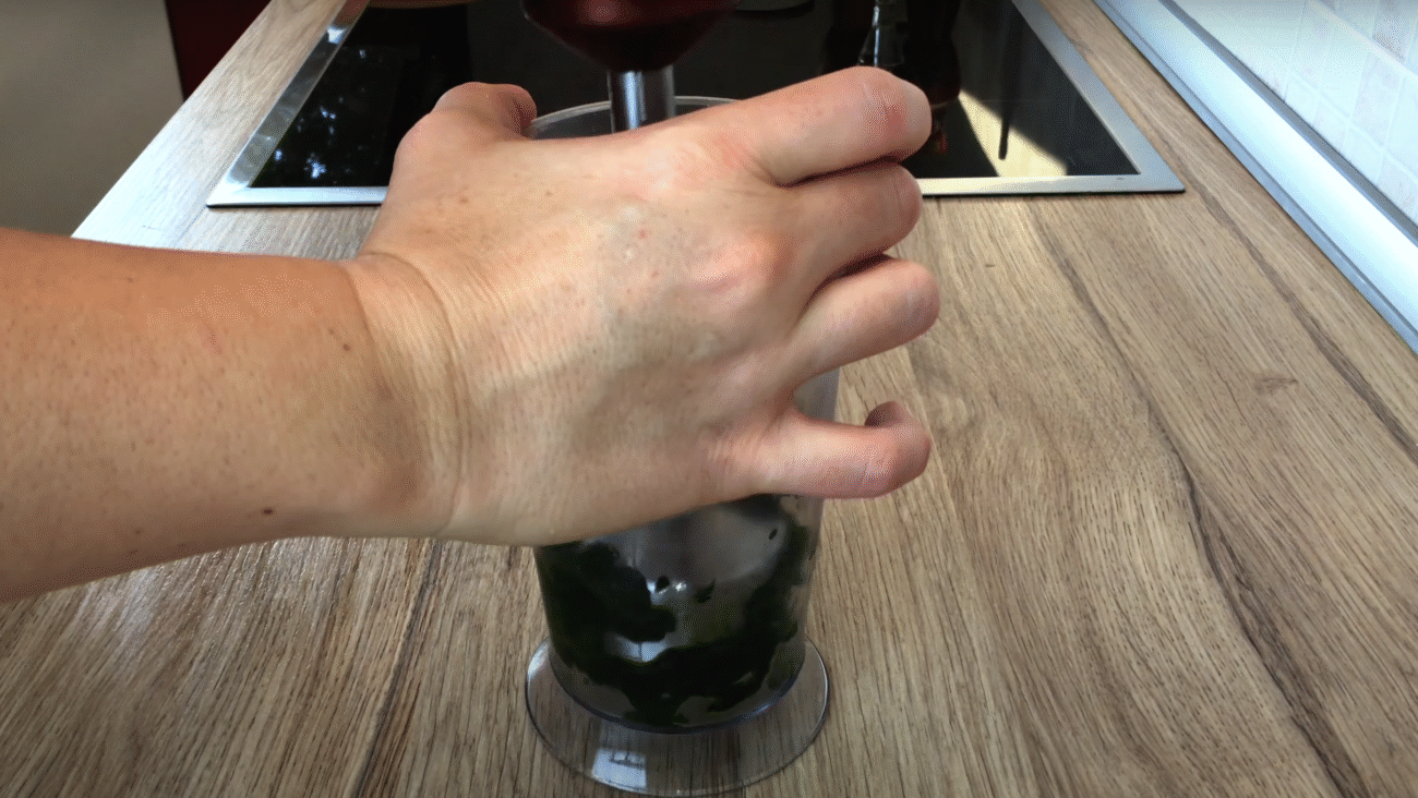 Iniziamo con il bollire— 150 g di spinaci, per un minuto o due. In alternativa agli spinaci possiamo utilizzare la bietola od altra verdura. Quello che importa è che vi sia un bel colore verde scuro al termine della procedura. Bolliti i nostri spinaci, li trasferiremo in un bagno freddo.