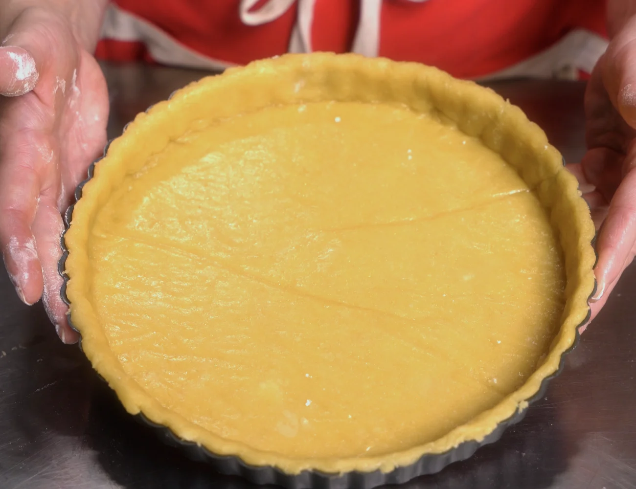 - Preparazione della Crostata: Trasferisci l'impasto steso in una teglia per crostata precedentemente unta o rivestita con carta forno. Premi delicatamente l'impasto nei bordi della teglia e rimuovi l'eccesso di pasta dai bordi.