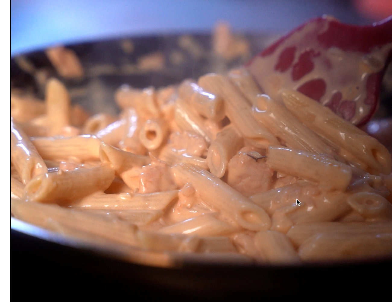 Aggiungiamo le penne e Flavia inizierà la sua danza di mantecatura con la padella…