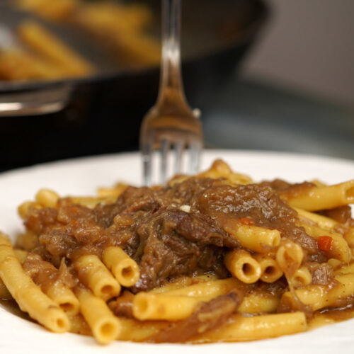fantastica anche così ma a me piace di più nella variante che faccio io (ispirata da un brasato che fa mia nonna per natale): niente carota ne sedano, aggiungo un rametto di rosmarino una foglietta di alloro e uno spicchietto d’aglio nel soffritto iniziale, metto altro vino per raboccare invece dell’acqua. infine lascio restringere tutti i liquidi e non la giro, uso una pentola d’acciaio perché favorisce la caramellizzazione del fondo e, quando si sta quasi bruciando, tolgo la carne e deglasso il fondo con altro vino. viene più sapida grazie alla mallard e più agrodolce con tutto quel vino. in più le erbe aromatiche favoriscono un profilo pungente piuttosto che quello rotondo che si ottiene con sedano e carota. mi piace in tutti i modi ma suggerisco di provarla così per cambiare