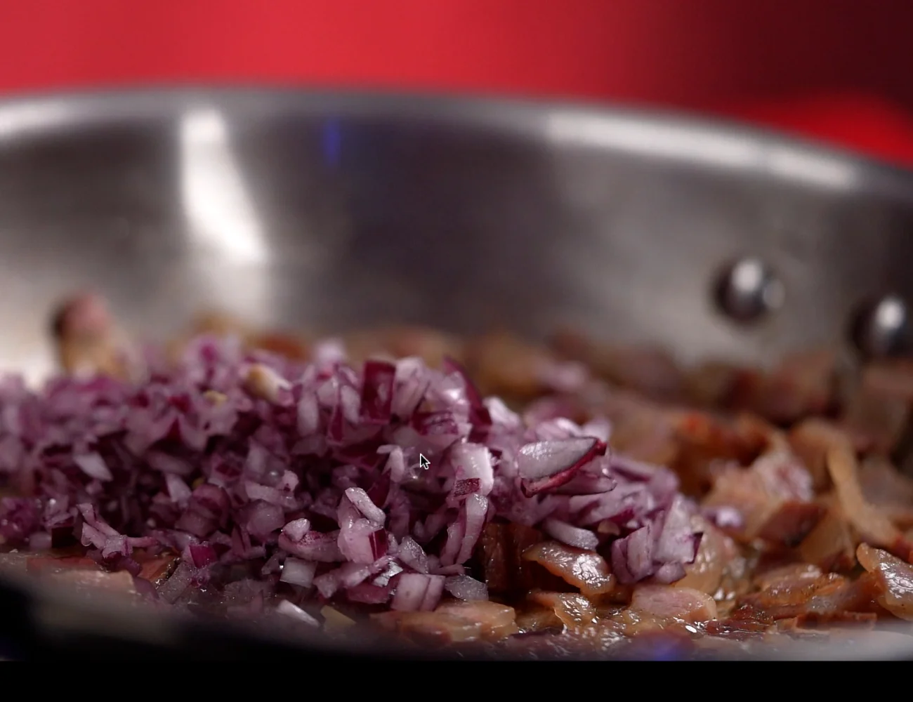 E ci tagliamo la pancetta e la cipolla.